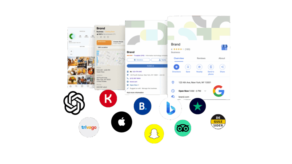 Uanset om dine kunder søger via kort-apps, stemmeassistenter, søgemaskiner eller anmeldelsessider, ser de altid de rigtige oplysninger om din virksomhed.